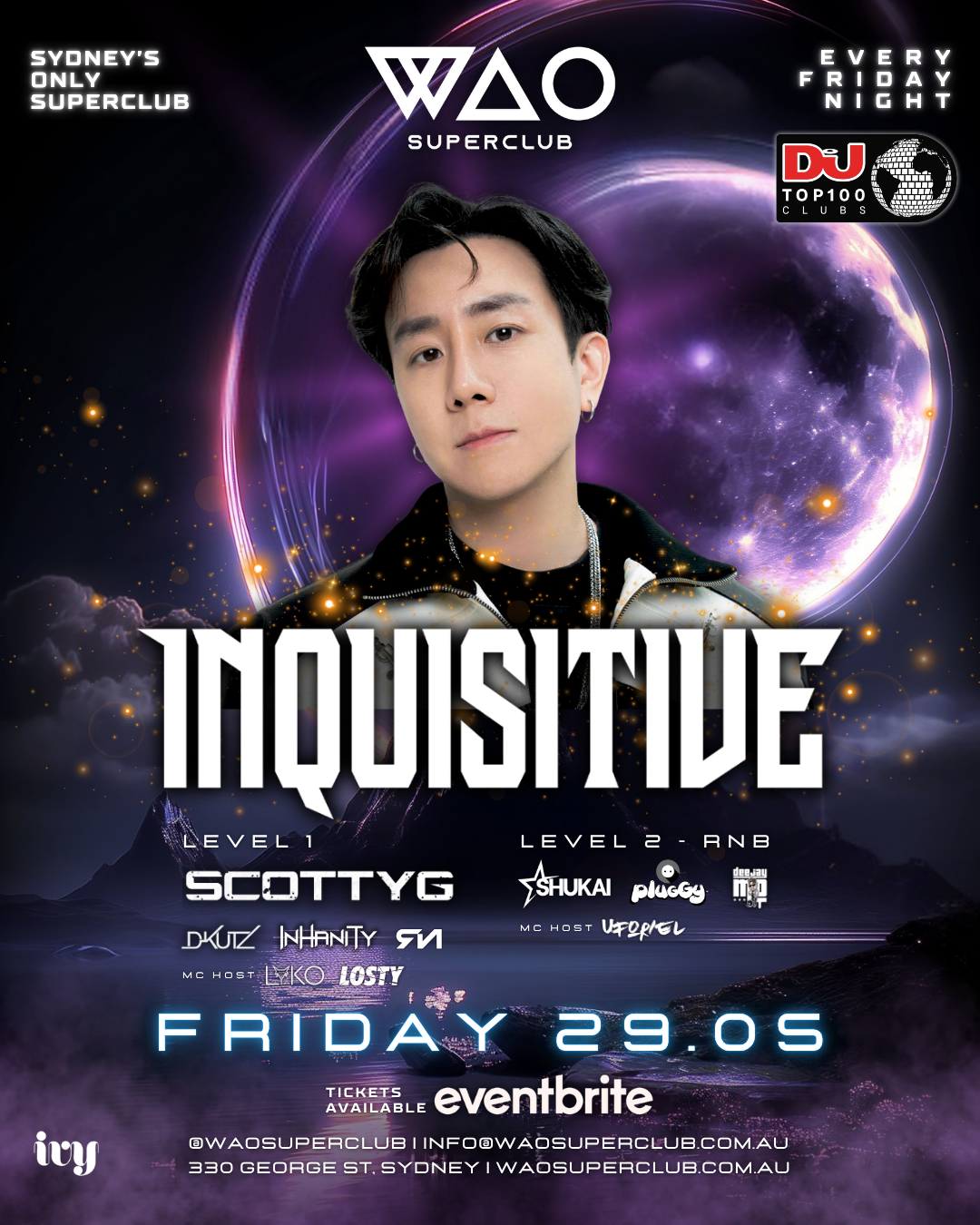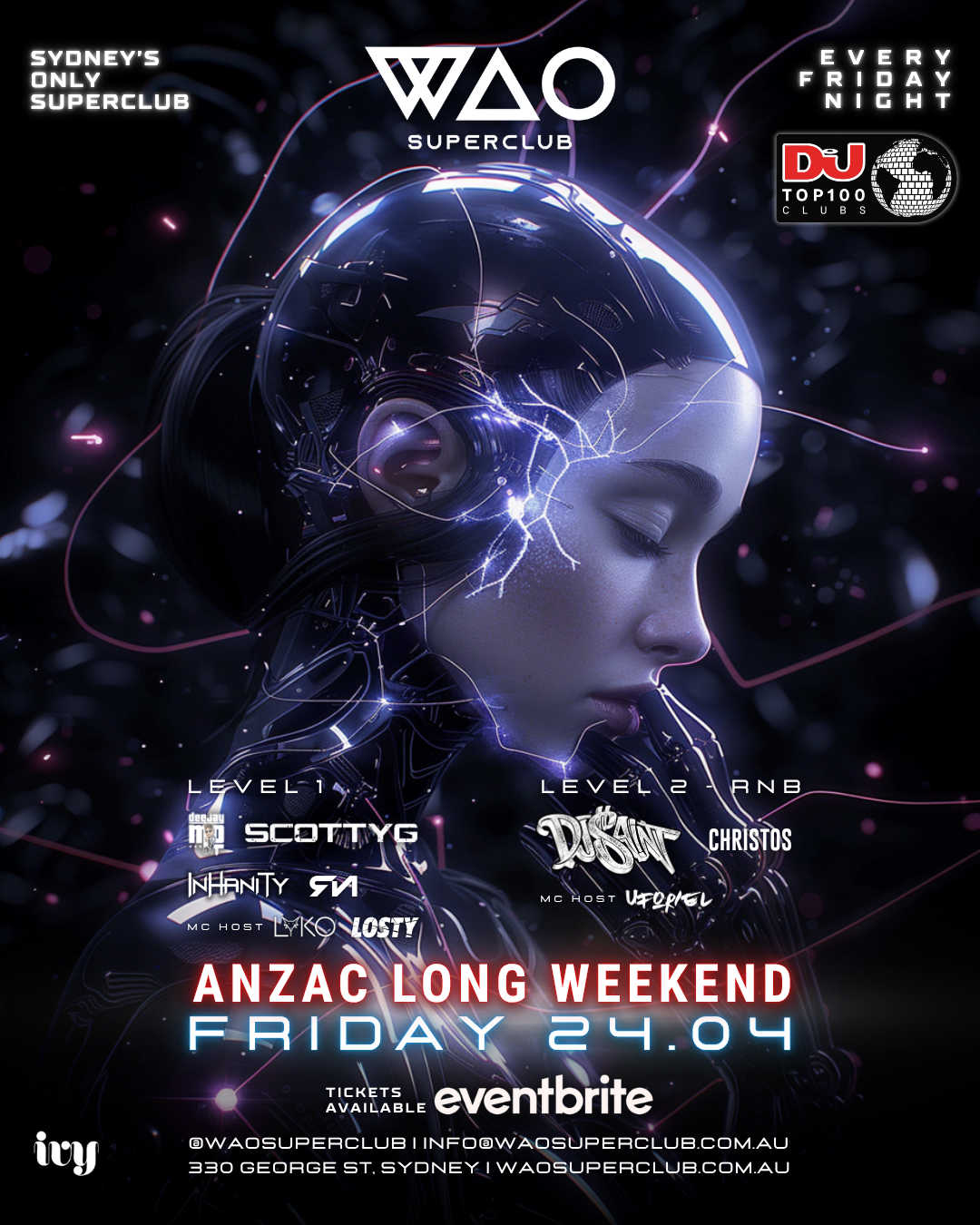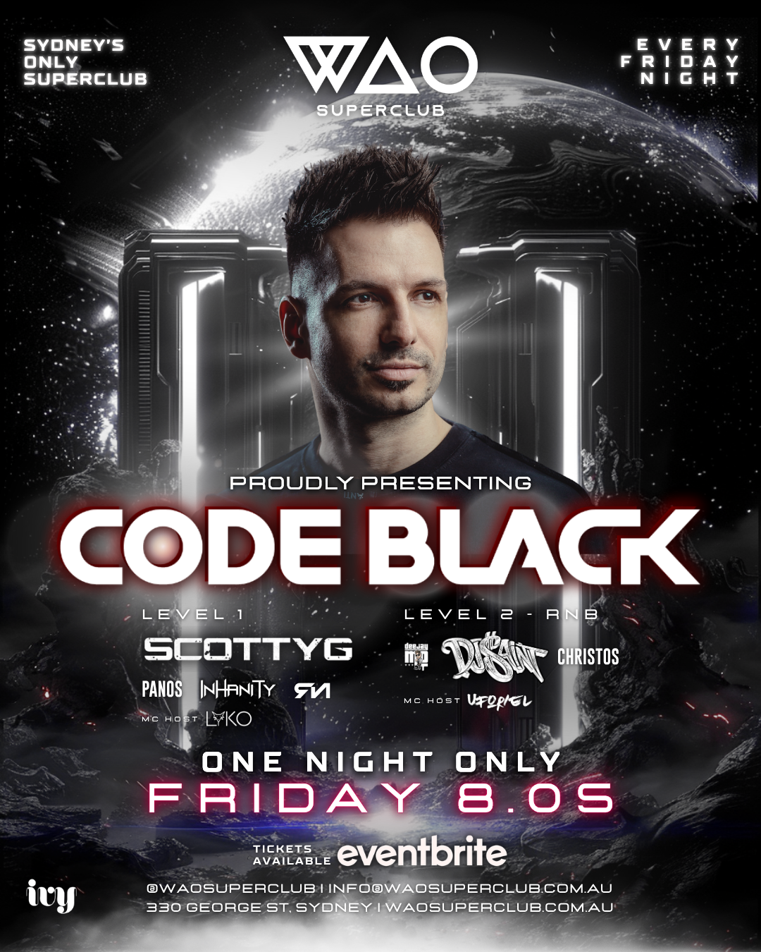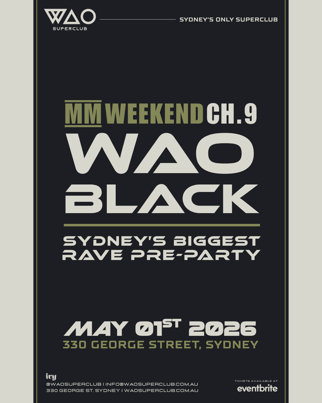 WAO Superclub is Australia’s largest nightclub brand, delivering Sydney’s biggest Friday nights at the iconic Ivy since 2021. Multi-level, high-impact production meets RNB, Tech House, Techno & Hardstyle, with world-class international DJs, luxury VIP booths, Vegas-style bottle service, and unmatched energy at monumental scale.